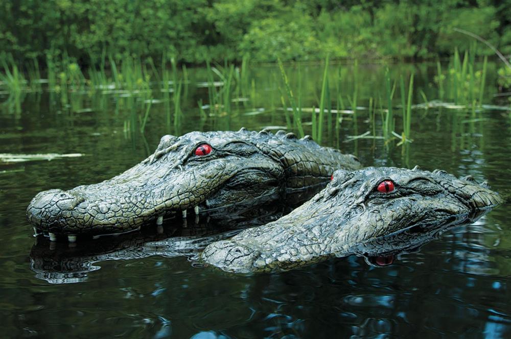 Realistic floating alligators scare away fish-eating pests like Herons, Egrets, Cormorants and other hungry animals.