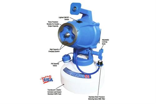 The Hurricane ES™ Electrostatic Fogger uitilizes Electrostatic Technology to charge each droplet to provide effective applications of formulations. The droplets stay separated due to the charged nature allowing uniform coverage on the entire target surface. It is ideal for spraying