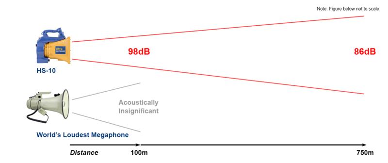 NEW HS-10, next generation of the HS-Micro, is a self contained, portable acoustic hailing device that comes in two models. Weighing only 15 lbs, the HS-10R packs a peak acoustic output of 144dB for a communication range of 750+m. Easily accessible, the built-in high frequency alert tone is readily activated with the push of a button.