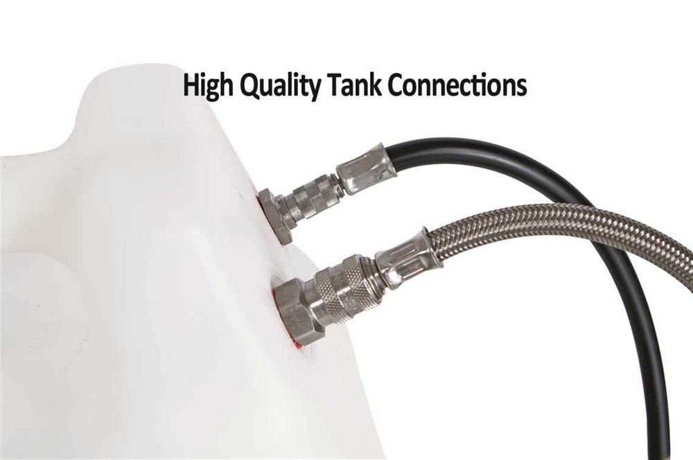 5.3 gallon (20 liter) poly tank w/stainless steel carriage frame: increase the fogging times by adding a quick change poly tank and stainless steel tube frame cradle. Comes with all stainless steel quick-couple fittings.