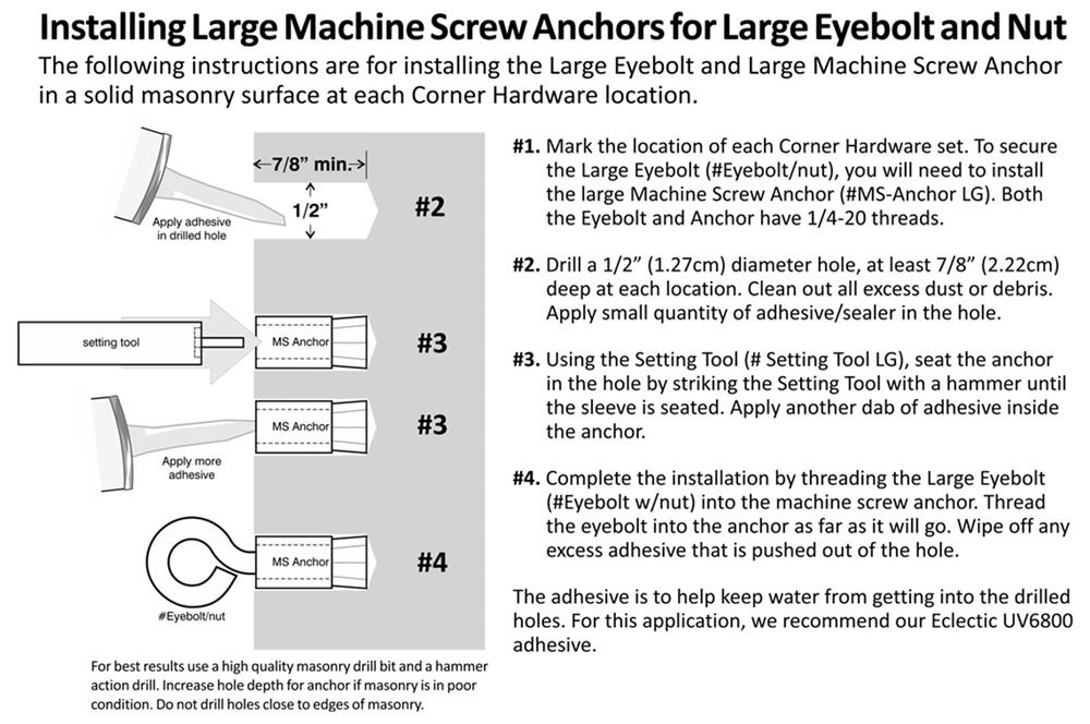 MS Anchor LG is the ¼-20 NC machine screw anchor for our HD large eyebolt corner hardware and has a pull out strength of 800 pounds (properly installed in solid concrete).