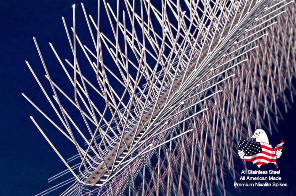 Nixalite of America Inc designs and manufactures the Premium Nixalite All Stainless-Steel Bird Spikes in the USA with materials processed in the USA. These flexible spike strips repel all bird species, in all levels of infestation, on all types of architectural surfaces. They eliminate costly cleaning and structural maintenance caused by pest birds and their filthy habits. They protect people from the health hazards associated with pest bird waste.