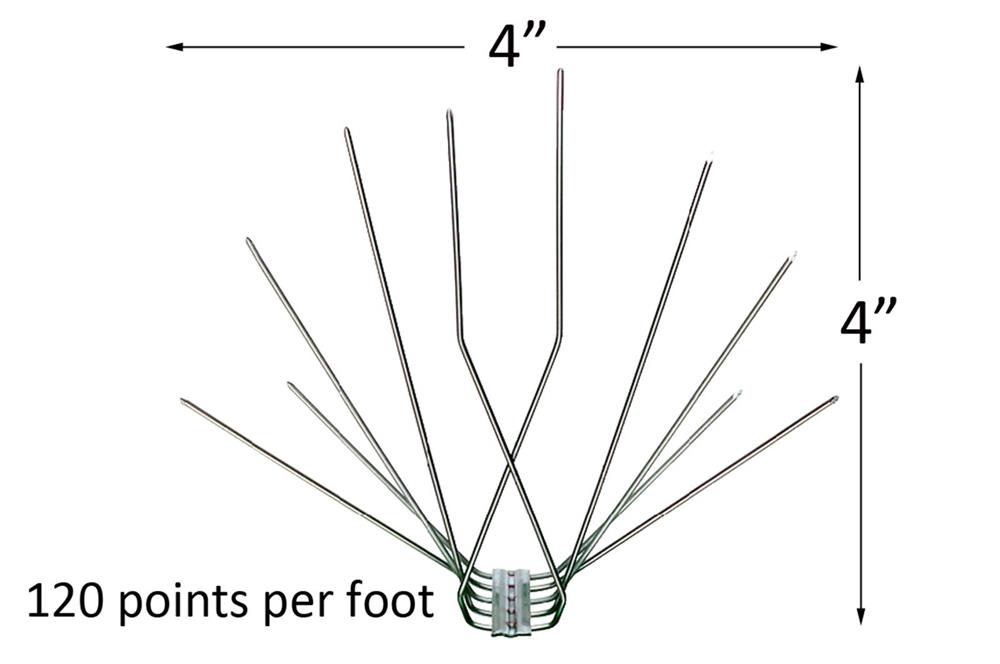 C. Premium Nixalite Model S: Full row spike, 4” high (10.2 cm), 4” wide (10.2 cm) NO LESS THAN 120 wire points per foot. Full 180-degree wire coverage. For all bird species on all types of surfaces. Use in conjunction with