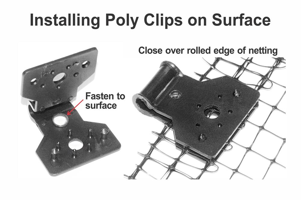Poly Clips provide a low cost, easy to install method for perimeter fastening on bird netting or poly based fence.