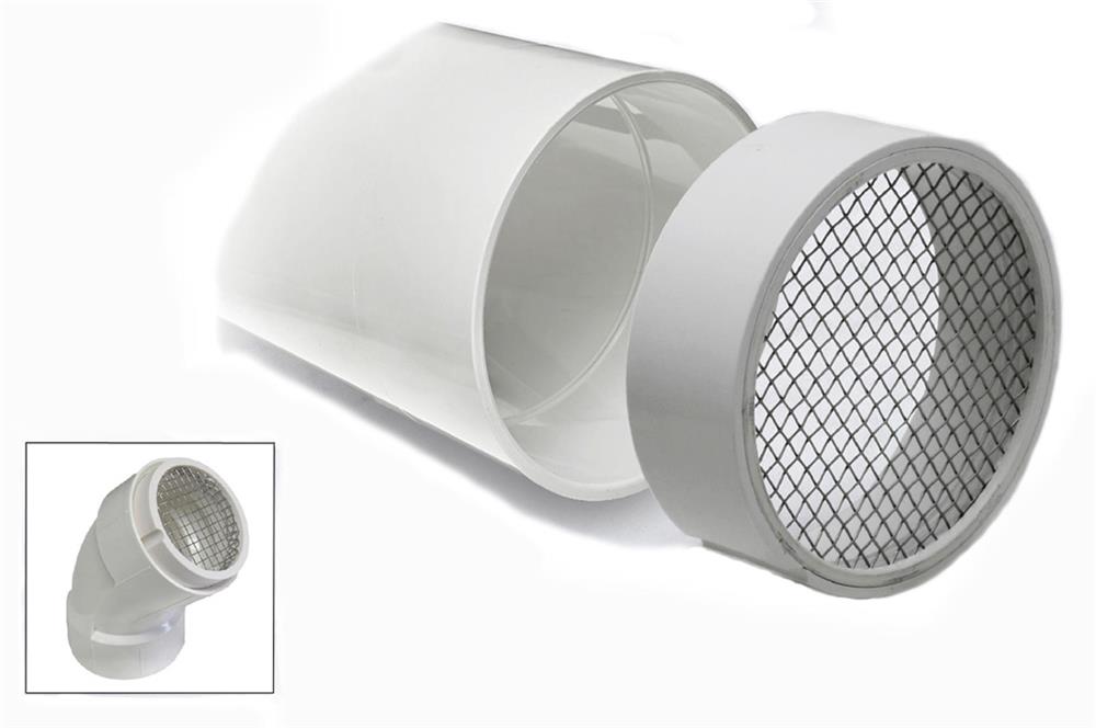 Prevent wildlife, leaves and debris from getting into your PVC exhaust vent pipes. Available in 2", 3", 4" and 6" sizes. Easily attaches to standard PVC pipe fitting or elbow flange (not included). Designed with a slotted side that allows for condensation to drain. These 3/16" mesh stainless steel screens are great for excluding birds, rodents, and large insects from furnace vents, water heater vents, power vents and exhaust vents.