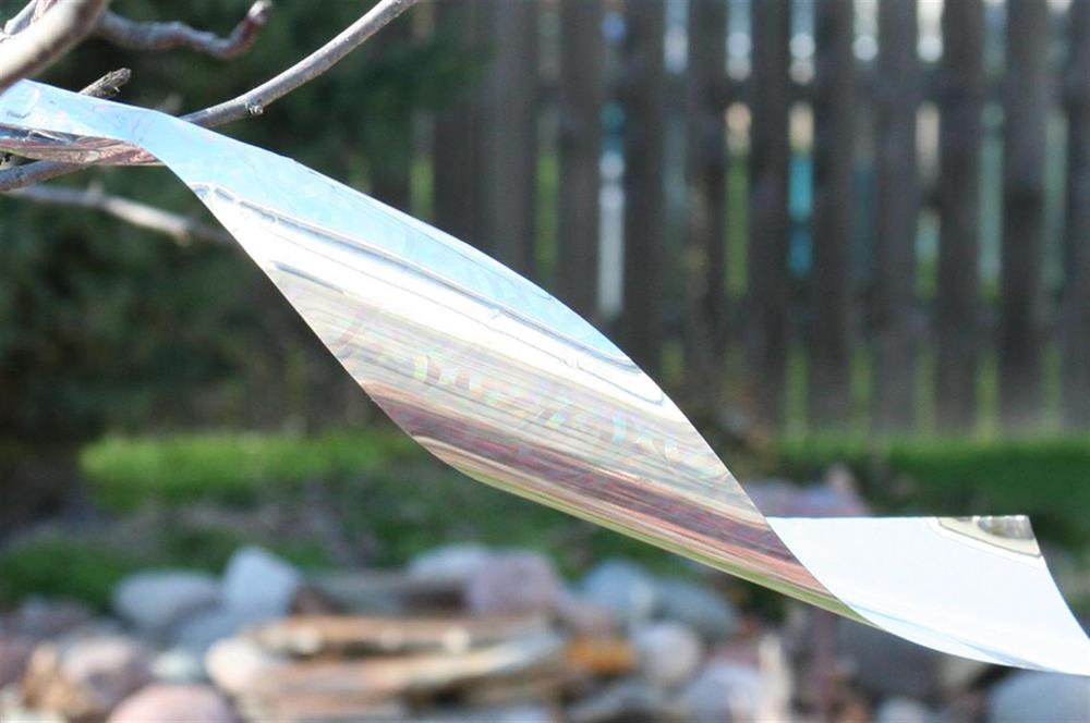 The light reflected from its 2" wide holographic surface is menacing to most pest birds. Movement from wind action produces a metallic rattling sound which is unsettling to birds and cautious deer. When applied in a line fashion along a narrow ledge or on top of a fence, the ribbon can deter bird roosting. If cut into 24” to 30” strips and hung from the outer limbs of trees, it provides a useful deterrent for small orchards and landscaping. Easily cut to the desired length with scissors.