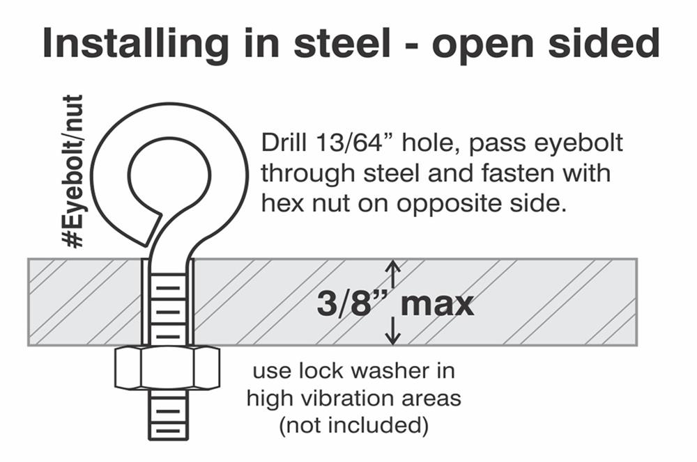 Large Eyebolt w/Nut HD stainless steel eyebolt, 9/16” I.D., 1” stem, 1/4-20 thread with stainless hex-nut. For steel or masonry surfaces – masonry anchors sold separately.