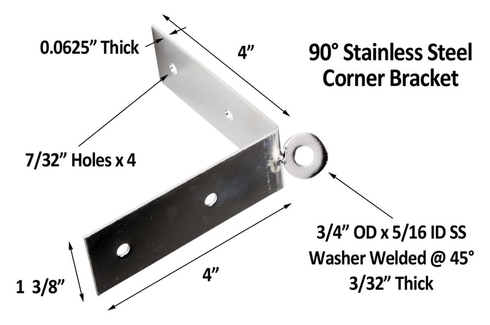 Made of 1-3/8” wide and 1/16” thick stainless steel stock, the outside corner bracket has 2 legs 4” long that mount on either side of a 90o corner. Each leg has 2 - 7/32” diameter mounting holes.