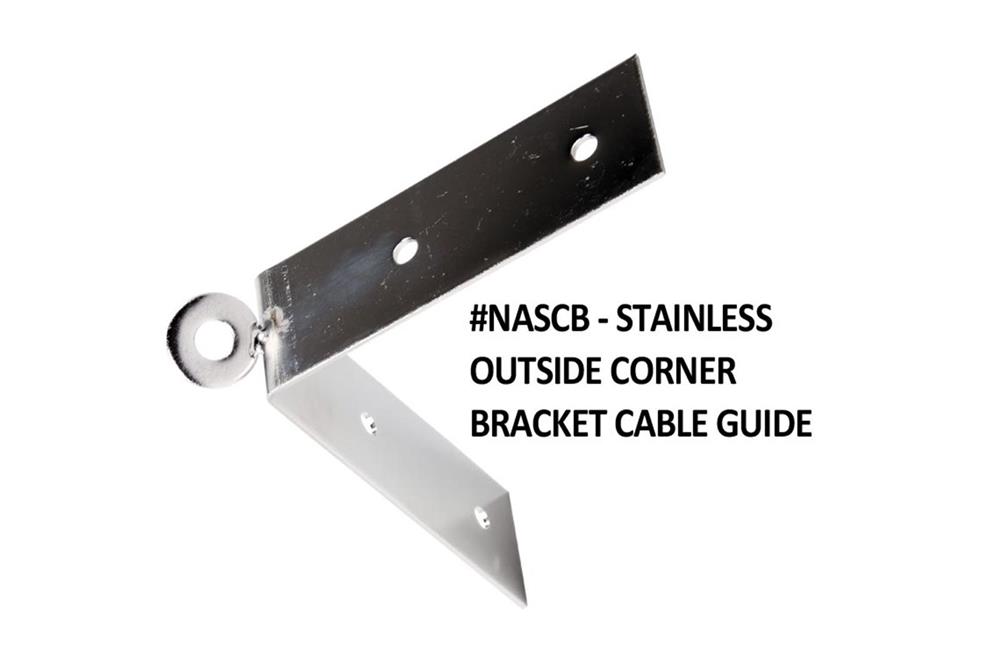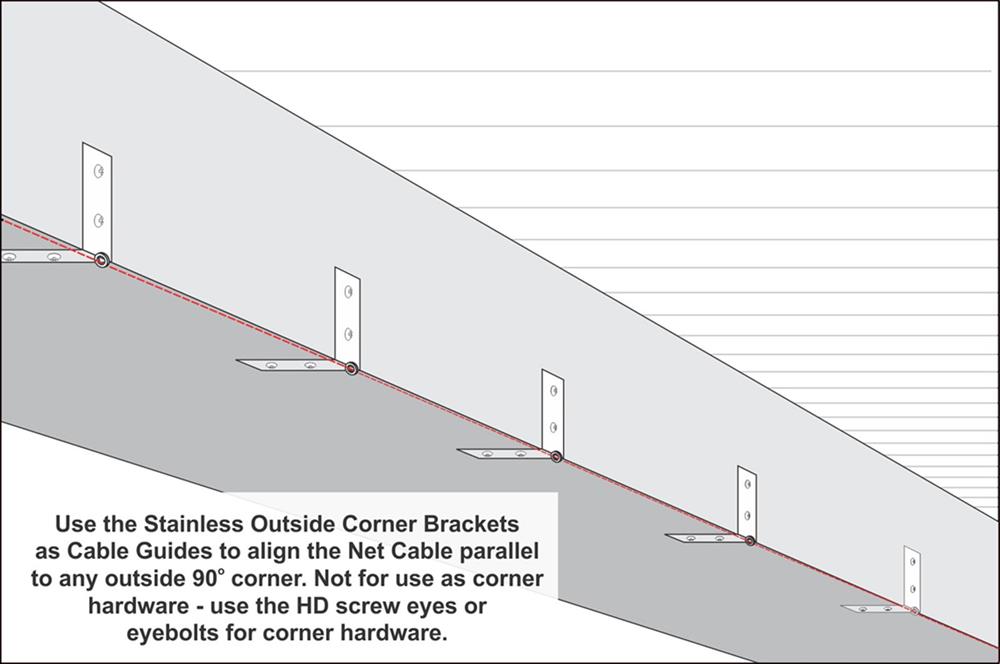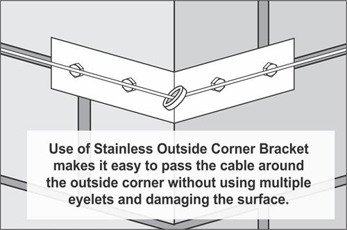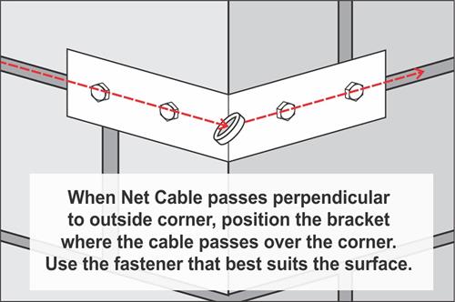 Stainless outside corner brackets are used to simplify the process of running the Net Cable around or along an outside corner. Without the bracket, running Net Cable around or along the corner used multiple sets of hardware on each side of corner – often running the risk of damaging the surface.