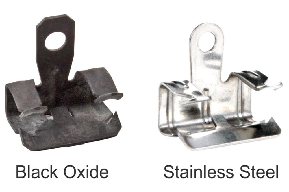 Available in black oxide coated spring steel or in spring temper stainless steel.